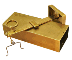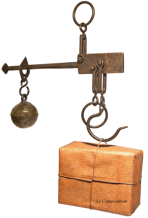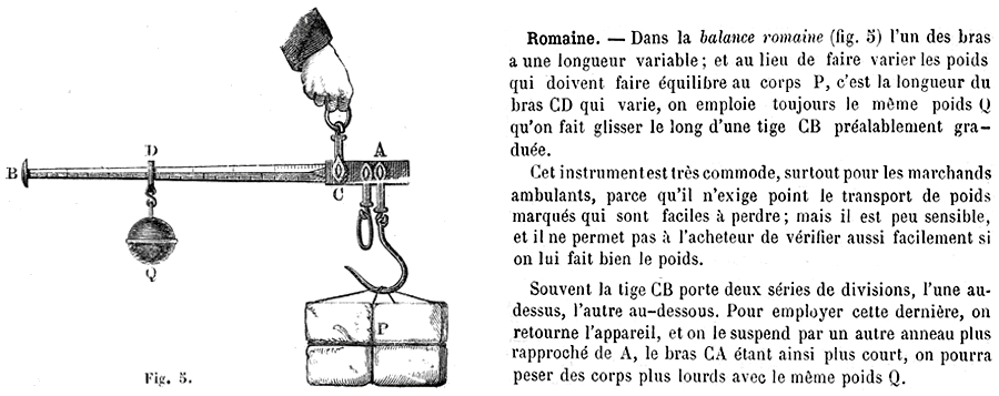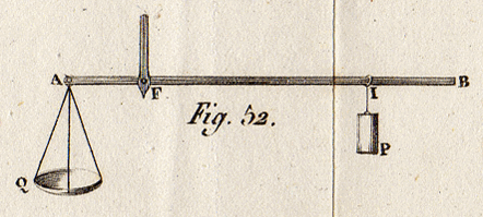 "De la Romaine. - La balance romaine est aussi un levier droit du premier genre, mais dont les bras FA, FB (fig. 52) sont inégaux. A l'extrémité A du bras le plus court, on suspend le corps dont on veut trouver le poids Q ; on l'attache par un crochet, ou bien on le pose dans un bassin qui est suspendu librement au point A, comme dans la balance ordinaire. Sur l'autre bras FB de la romaine est un poids connu p, mobile au moyen d'un anneau le long de ce bras ; de sorte qu'en le faisant glisser à une distance convenable FI de l'appui F, il fait équilibre au poids du corps qui agit de l'autre côté"... |