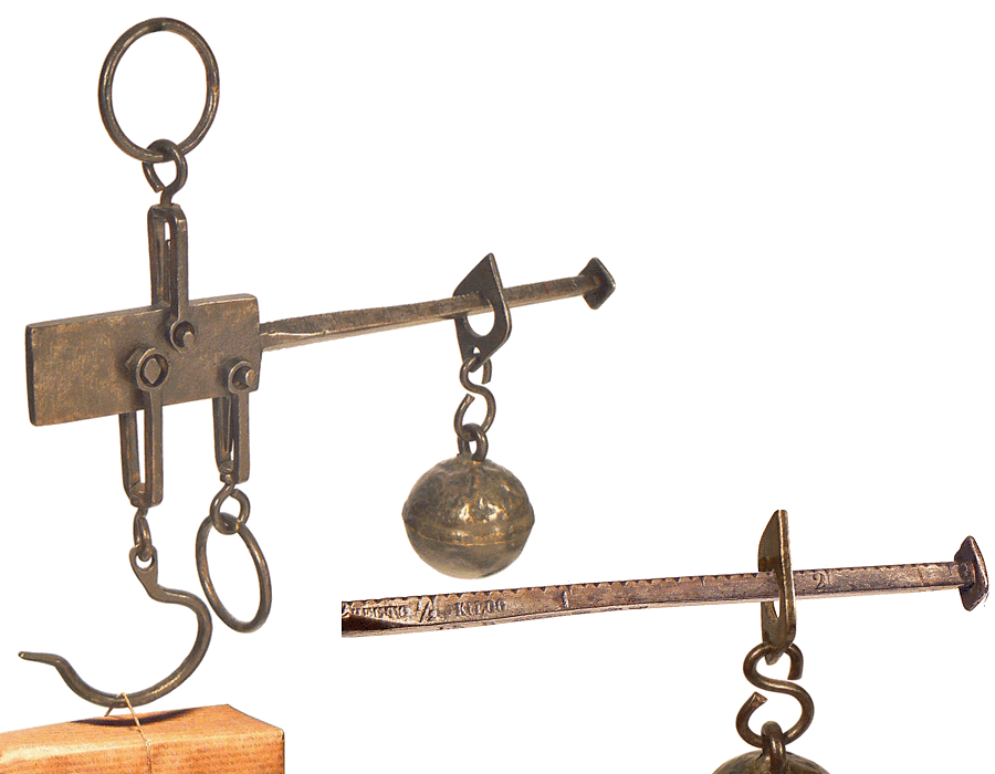 Petite balance romaine, longueur totale 23 cm. Portée 2,5 et 8 kg |