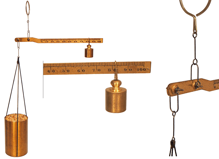 On compte 20 divisions entre les traits marqués 1 et 2. Chaque petite division correspond à 50 g. La balance étant à l'équilibre, l'anneau supportant le contrepoids joue le rôle de curseur et donne le résultat recherché : 1,8 kg |