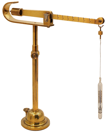 Balance de Westphal - hauteur moyenne 25 cm - A droite, ataché à un fil de platine, le plongeur thermométrique de 8 cm Vers 1910 |