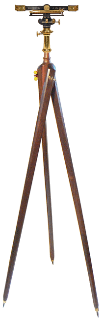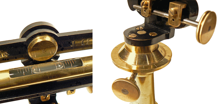 Le niveau à bulle permet d'obtenirr l'horizontalité et, sur la base de l'instrument, le cercle divisé indique l'angle entre deux directions d'un plan horizontal. |