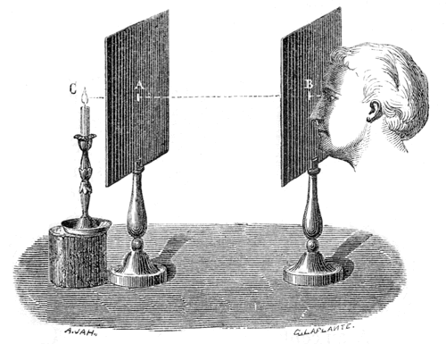 L'appareil était utilisé par les arpenteurs pour les opérations de terrain. Comme beaucoup d'instruments d'arpentage, il est placé sur un pied en chêne à trois branches ou sur un piquet simple. La visée se fait par alignement de trois éléments : l'orifice étroit de la première petite plaque de laiton ou pinnule, le réticule croisé de l'autre pinnule parallèle à la précédente et un point d'une mire qui est placée à une certaine distance. C'est une application du phénomène de propagation rectiligne de la lumière que l'on peut vérifier en réalisant l'expérience illustrée par le dessin suivant : |