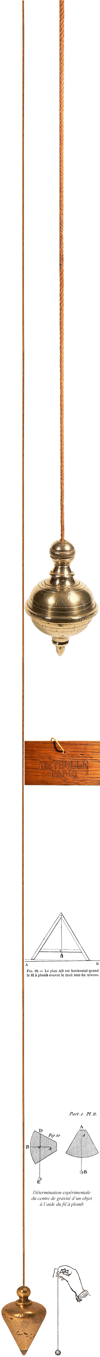 Les lignes qui suivent sont tirées de l'ouvrage de très petit format (8 x 12,5 cm) "LE NEUTON DE LA JEUNESSE ou dialogues instructifs et amusans entre un père et sa petite famille, sur la Physique, l'Astronomie et la Chymie" traduit de l'anglais par Théodore-Pierre Bertin (édition de 1808). Il s'agit, pour ce cinquième dialogue, d'expliquer l'attraction exercée par la terre sur les objets et donc, sur la boule de plomb accrochée à un fil. Viendra, plus loin, appuyé par les dessins de l'une des planches du livre, un exemple d'utilisation du fil à plomb pour déterminer la position du centre de gravité d'un objet ... |