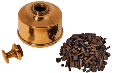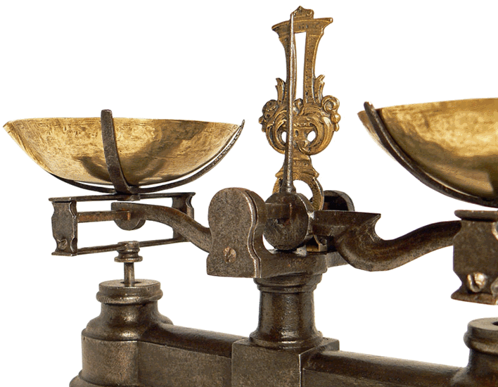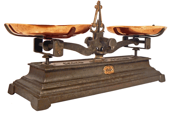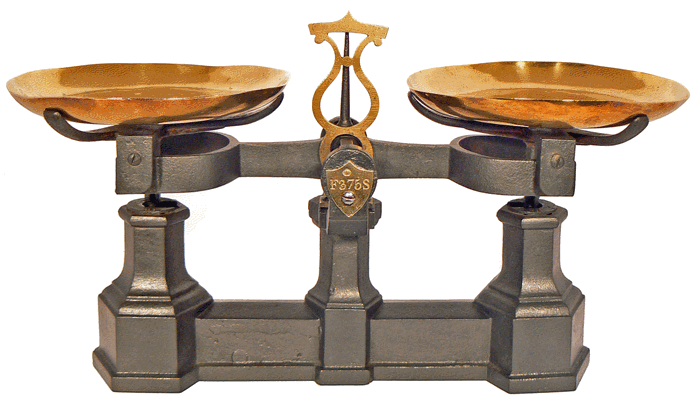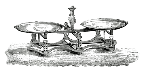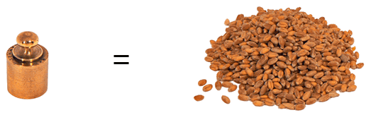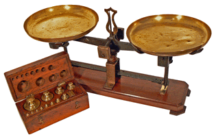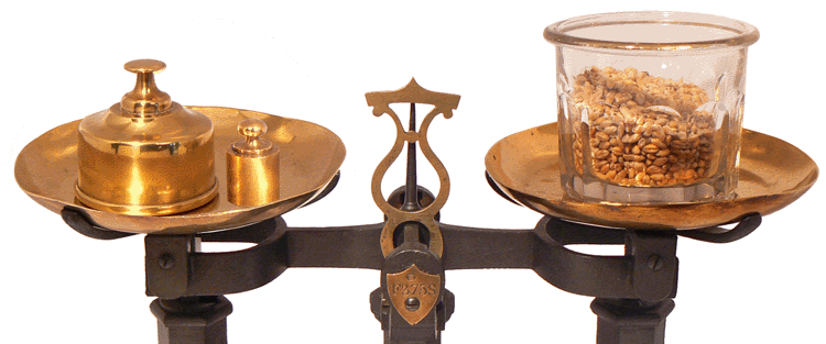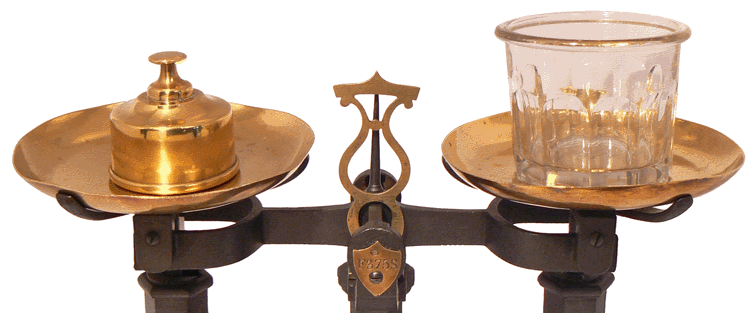 Pour éviter des calculs , il tare ce récipient, une fois pour toute, afin de l'utiliser ensuite de manière systématique. Dans ce but, il procède à un équilibre en plaçant sur l'un des plateaux le récipient vide et sur l'autre plateau la tare qu'il garnit de grenaille ou de billes jusqu'à obtention de l'équilibre. Lors de tous les équibres à venir, la tare et le récipient taré doivent occuper la même place. Généralement, la tare est placée sur le plateau de gauche. |
