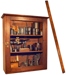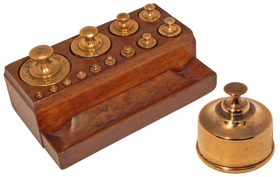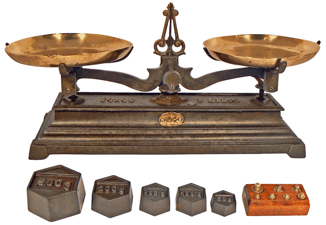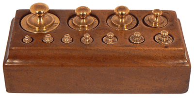 Cette balance robuste aurait pu, autrefois, trouver sa place dans le compendium métrique d'une école élémentaire. Elle aurait été accompagnée, par exemple, de cet ensemble de masses marquées : à gauche, la série de masses en fonte totalisant 950 g et à droite, sur un petit socle en bois, 7 masses en laiton valant respectivement 1, 2, 2, 5, 10, 10 et 20 g complétant la série pour l'amener à la valeur de 1 kg, "force" ou "portée" de la balance. |