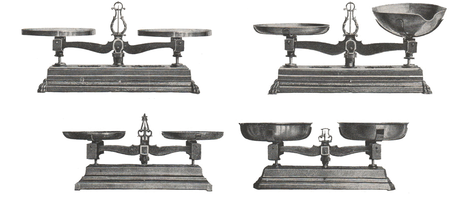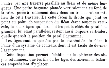 Viennent ensuite une balance à plateaux à "bords renversés" et une balance possédant un plateau "creux à bec". Pour terminer, un modèle "pour le ménage" et un modèle avec "plateaux demi-creux, dits Lyonnais, pour marchands ambulants". |