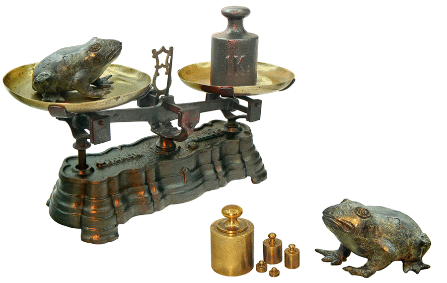 Sur le plateau de cette autre balance, la grenouille voulait peut-être, non se faire aussi grosse que le bœuf, mais aussi lourde que la masse de 1 kg en fonte... mais elle ne pèse que 233 g. |