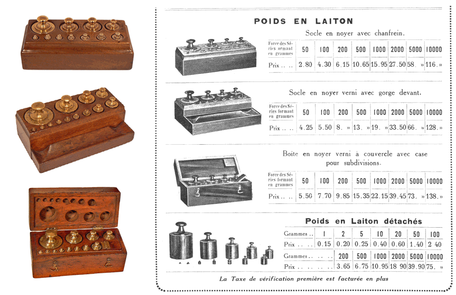 Série de masses sur socle à gorge, totalisant 2 kilogrammes. A droite, une tare variable (de 75 g, vide, à 325 g, pleine) |