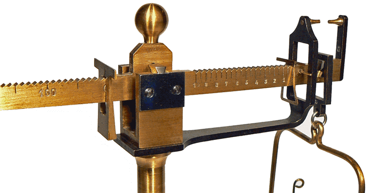 C'est une balance de type romaine. Deux masselottes formant curseurs se déplacent de part et d'autre du couteau, axe de rotation du fléau. En l'absence de charge, le fléau est à l'horizontale lorsque les deux curseurs sont, le grand sur le "zéro" des dizaines et le petit sur le "zéro" des unités. |