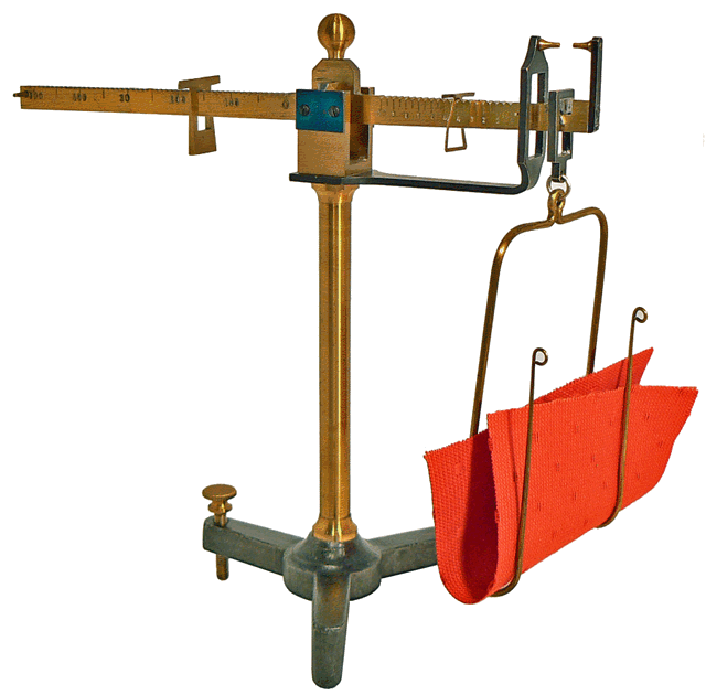 Un échantillon de tissu de 1 dm² (un gabarit métallique permet de découper un carré de 10 x 10 cm ) est placé dans le support en forme de crochet suspendu par un étrier à l'une des extrémités du fléau. L'équilibre, alors détruit, doit être rétabli en déplaçant les deux curseurs. |
