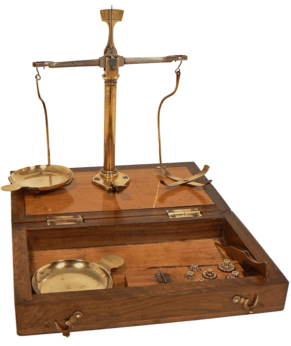 Malgré des dimensions réduites, ce trébuchet est équipé d'étriers métalliques rigides pour la suspension de ses plateaux et non de cordons souples comme c'est généralement le cas pour les instruments de cette taille. Le diamètre des plateaux est égal à 5 cm. |