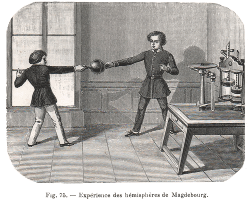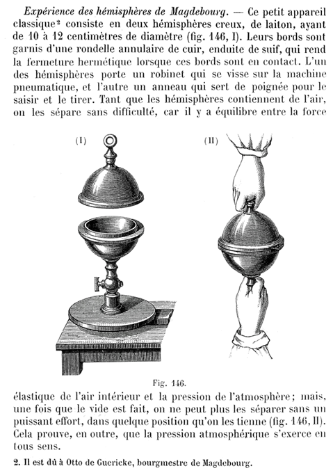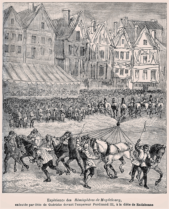 Lors de l'expérience historique réalisée en 1654 dans la ville allemande de Magdebourg, Otto de Guéricke - scientifique et inventeur qui en était le bourgmestre - utilisa des hémisphères d'un diamètre de plus de 60 cm. On rapporte, dans certains ouvrages, qu'il fallut seize chevaux répartis en deux attelages tirant en sens opposé pour les séparer. Les auteurs les plus modérés parlent de six chevaux en tout ... |