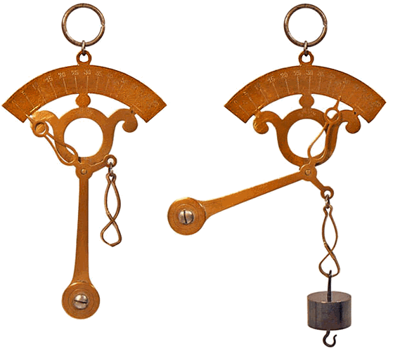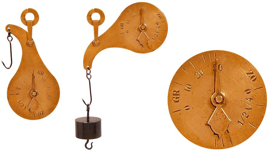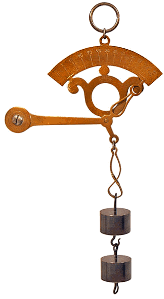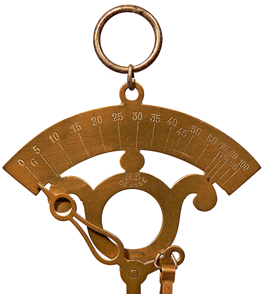 Sur ce peson sans signature, c'est le corps de l'instrument qui pivote lorsqu'on fait agir une charge. Dans le même temps, l'échelle graduée défile devant l'aiguille qui, lestée dans sa partie la plus large, demeure verticale. Cette petite balance, très légère puisqu'elle ne pèse qu'un peu plus de 12 g pour une longueur, à vide, égale à 9,5 cm centimètres, possède deux graduations. L'extrémité effilée de l'aiguille est utilisée pour lire la valeur de la masse en grammes (de 0 à 50 g) et l'extrémité plus large la correspondance en onces, unité anglo-saxonne, (de 0 à 2 oz). |