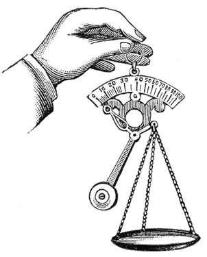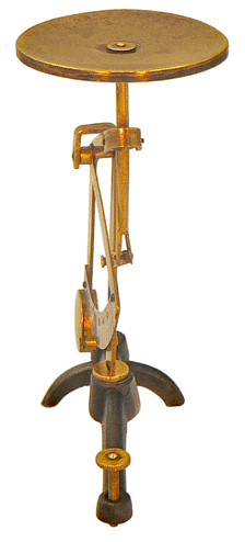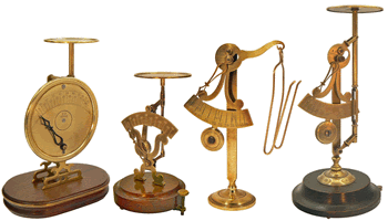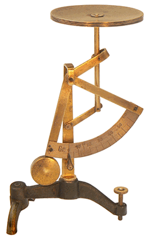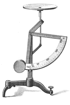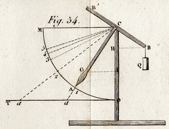 Dans ce type de peson, dit peson à tangente, c'est la tangente de l'angle suivant lequel tourne l'aiguille qui est proportionnelle à la charge. Si l'on observe le dessin tiré de l'ouvrage de Poinsot, on comprend que - dans le quadrant considéré - la valeur de l'angle augmentant moins vite que sa tangente, les divisions de l'échelle graduée ne sont pas équidistantes : les écarts sont de plus en plus petits au fur et à mesure que l'on avance sur la graduation. On perd donc de la sensibilité lorsque l'on augmente la charge. |