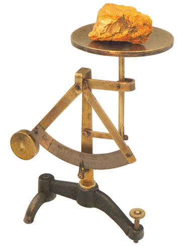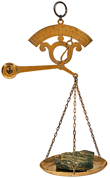Pesée d'un morceau de soufre natif, sorti d'une ancienne collection de roches. |