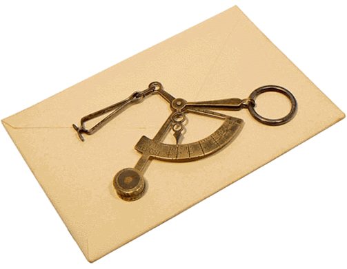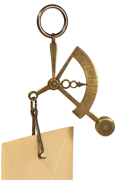 Le troisième modèle est un très petit pèse-lettres. Il suffit de le comparer à l'enveloppe de carte de visite de 8 x 12 cm sur laquelle il est posé ou qui est suspendue pour se rendre compte de sa taille. Il permet de peser jusqu'à 30g avec une bonne précision. |