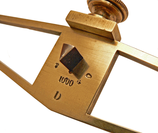 De part et d'autre du couteau central par lequel repose le fléau, on observe, à gauche, la marque de fabrique de la Maison EXUPÈRE consistant en un ovale surmonté d'une couronne et à droite, la marque de "vérification primitive" ou "marque première" laissée par le poinçon du bureau central d'étalonnage des Poids et Mesures. Cette marque "à la bonne fois" représente une poignée de main. |
