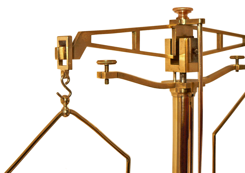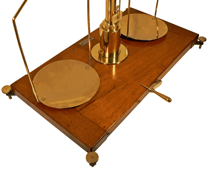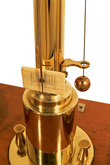 Avant une série de pesées, on procède au réglage de la direction verticale de la colonne en agissant sur les vis calantes situées aux quatre coins du socle de la balance. Le résultat est obtenu lorsque le fil auquel est suspendue une boule de laiton (on parle de "fil à plomb") est confondu avec l'axe vertical de l'ouverture circulaire d'une patte fixée à la colonne. |