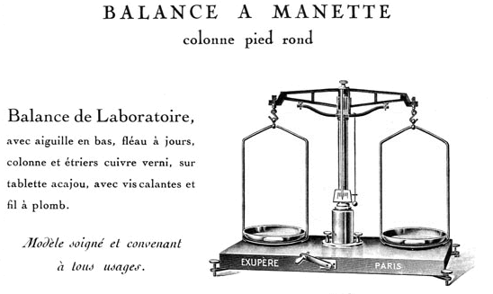 Sur la couverture du catalogue de la Maison EXUPÈRE, le texte du décret d'avril 1919 est suivi du montant de la taxe à verser à l'Etat "selon la nature des Articles" et qui sera "ajoutée au montant net de chaque facture". Par exemple, cette taxe est de 1 franc pour une balance de Roberval, 2 francs pour un trébuchet à 3 couteaux, 7 francs pour une bascule romaine de 200 à 1000 kg, 0,30 franc pour une masse en fonte de 500 g, 0,10 franc pour une masse en cuivre de 100 g ou encore 0,15 franc pour une subdivision de carat métrique... |