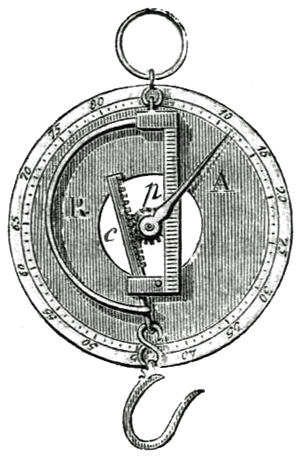 Notre instrument est composé, comme le montre l'image du DICTIONNAIRE DE L'INDUSTRIE ET DES ARTS INDUSTRIELS, d'un ressort cintré en acier R fixé à une des extrémités et dont l'autre est attachée à une crémaillère c. Cette crémaillère engrène un pignon p, dont l'axe porte l'aiguille A qui se déplace sur le cadran. |