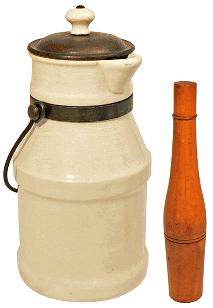 Près de l'étui du galactomètre, l'ancienne "biche à lait" de 1 litre en grès porcelaine et fer. |