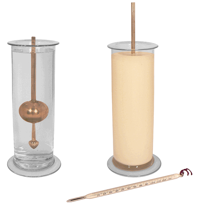 Le galactomètre est en équilibre dans l'eau puis dans le lait pur. Le thermomètre indique une température ambiante égale à 69 °F (échelle Fahrenheit), ce qui correspond à 20,5 °C (échelle Celsius). |