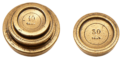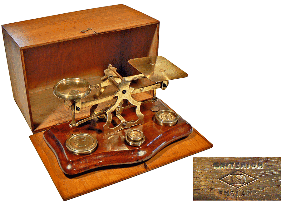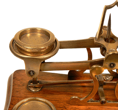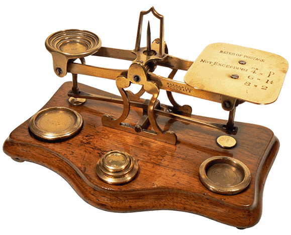 Il s'agit de petites balances du type Roberval utilisées pour peser le courrier ou, plus exactement, pour définir la tranche d'affranchissement applicable au courrier. Le plateau de gauche, plus petit et généralement circulaire, est destiné à recevoir les masses marquées de forme caractéristique (les "poids à godets") tandis que le plateau de droite reçoit la lettre. Au repos, les masses sont logées dans le socle en bois dont la longueur avoisine les 20 centimètres. |