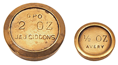 Cette première balance ainsi que la suivante qui possède sa boîte de transport, sont de fabrication anglaise. Toutes les deux sont accompagnées de masses marquées en onces (1/4 - 1/2 - 1 - 2 et 4 OZ). Il s'agit de masses signées J & J Siddons et Avery |