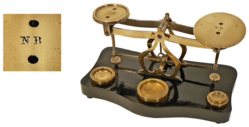 Le troisième modèle, ci-dessous est signé NB pour Narcisse Briais, constructeur français de la deuxième partie du 19e siècle. Les masses qui l'accompagnent sont, bien entendu, marquées en grammes (10 - 20 - 30 - 50 et 100 g). |