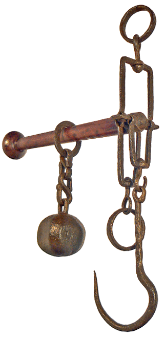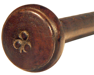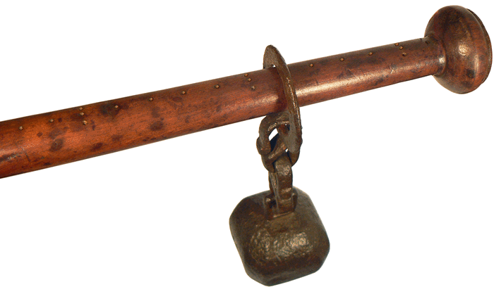 Le fléau de cette balance est en bois dur et mesure 22,5 cm. Un trèfle est frappé sur l'extrémité : il peut s'agir de la marque du balancier. Comme très souvent pour ce type de balance, deux capacités et donc deux sensibilités sont proposées suivant que l'instrument est suspendu par un anneau ou par l'autre. Le "côté fort" du grand bras de fléau correspond à la capacité la plus élevée et le "côté faible", à la capacité la plus faible. La photographie qui suit nous montre le côté faible permettant la pesée des objets de 1 à 16 livres. |