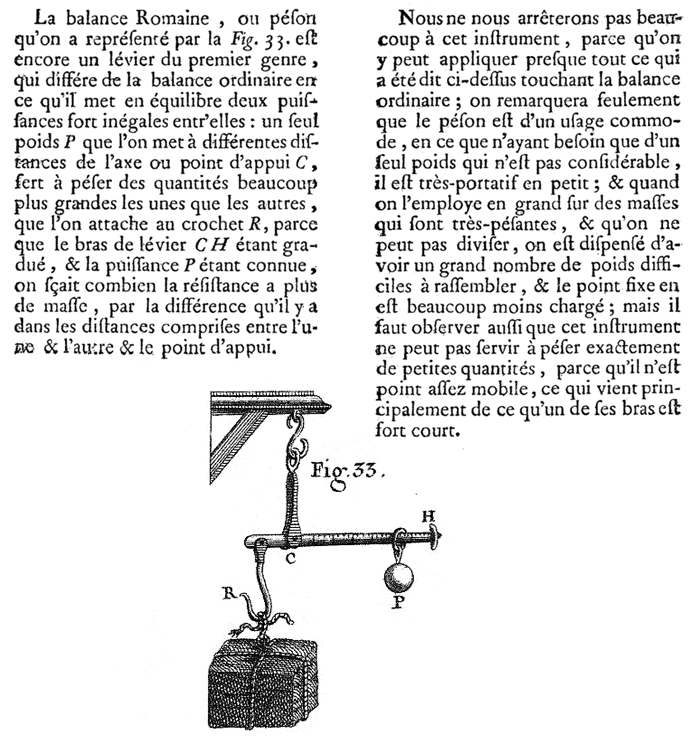 Dans ses LEÇONS DE PHYSIQUE EXPÉRIMENTALE (1745), l'Abbé NOLLET traite de la balance romaine. Nous avons modifié la mise en page de l'ouvrage pour rapprocher la figures 33, issue de la planche consacrée aux équilibres, du texte correspondant : |