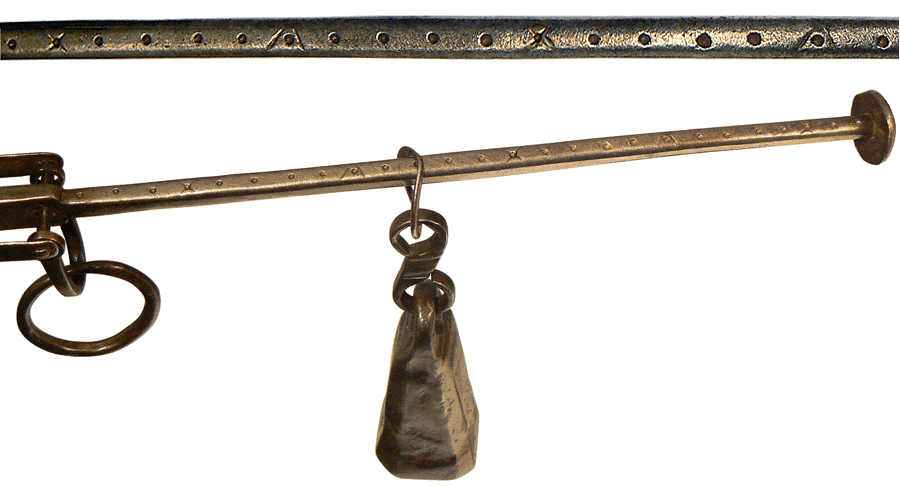 Le fléau de cette seconde balance romaine mesure 29 cm. Comme précédemment, le grand bras est gradué en livre ancienne dont les fractions sont marquées par des points. Des symboles géométriques simples permettent de repérer les séries de 5 et 10 points. Sur le côté fort du bras de fléau, deux croix consécutives correspondent à une variation de 5 livres. La graduation est donc réalisée en demi-livre ancienne. |