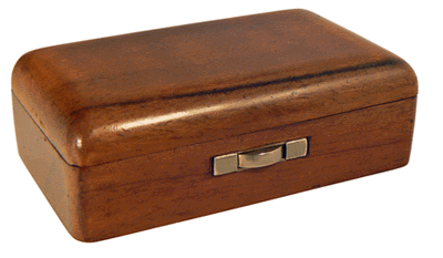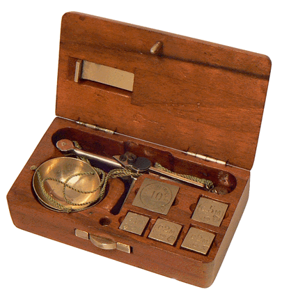 Le coffret en noyer mesure 6,5 x 3,5 x 2 cm. Il protège la petite balance, les poids en maillechort de 1, 2 fois 2, 5 et 10 carats métriques ainsi que quelques subdivisions en aluminium, marquées en "centièmes", qui se tiennent au fond du logement du poids le plus élévé. Un petite pince rangée dans le couvercle permet de manipuler ces poids. |