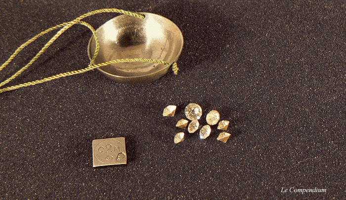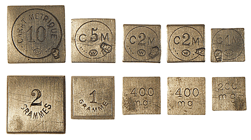 La face principale de chacun des poids porte sa valeur exprimée en carats métriques et la face opposée donne la correspondance en grammes. La face principale porte le poinçon de vérification primitive - la marque "à la bonne foi" représentée par une poignée de main - garantissant la validité de la valeur indiquée. La série totalise 20 c.m. soit 4 g. |