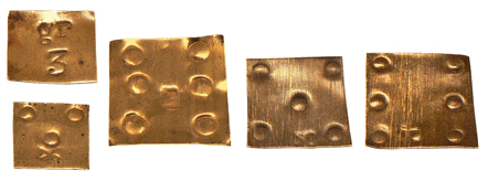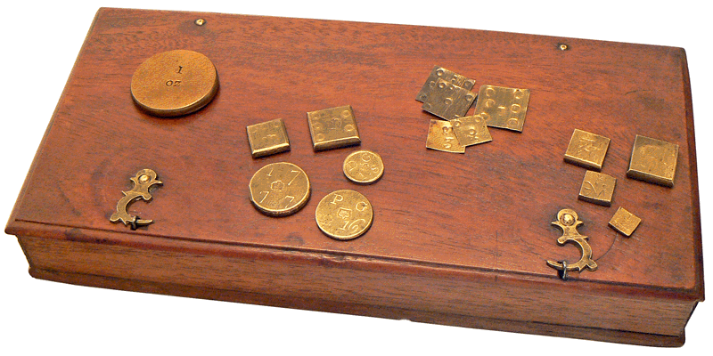 Les masses marquées accompagnant le trébuchet sont, ici, posées sur le coffret. Cinq d'entre elles, trois de forme ronde et deux de forme carrée, sont frappées de la couronne royale anglaise. Nous les avons pesées avec une précision de 5 mg : |