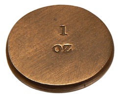 Cette masse marquée de 1 oz, en forme de palet d'un peu plus de 3 cm de diamètre, pèse (30,820 ± 0,005) g. Cette valeur ne correspond, ni à l'once avoirdupois (28,350 g), ni à l'once Troy (31,103 g) : mystère... |