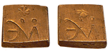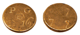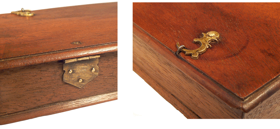 Les indications portées sur une face des trois premières masses rappellent celles des monnaies inscrites à la fin du tableau collé à l'intérieur du coffret. Il pourrait s'agir de tares monétaires permettant de vérifier les pièces de 1, 1/2 et 1/4 guinée (guinea) ... |