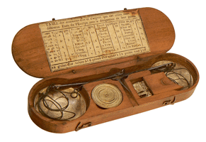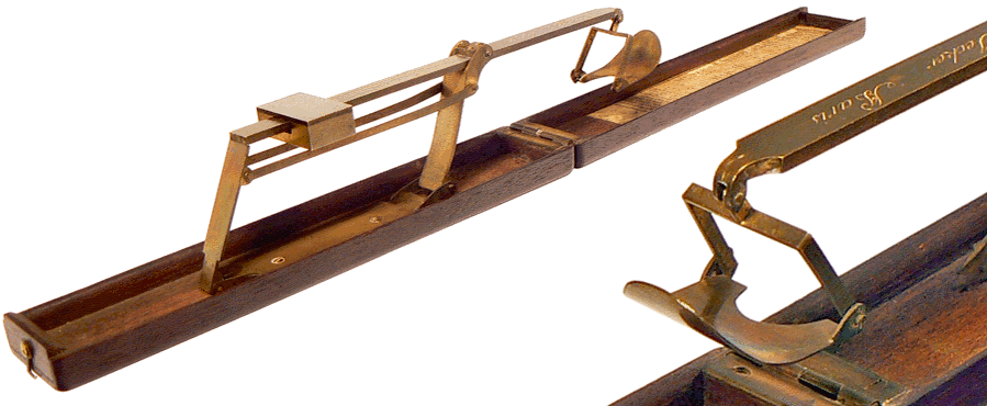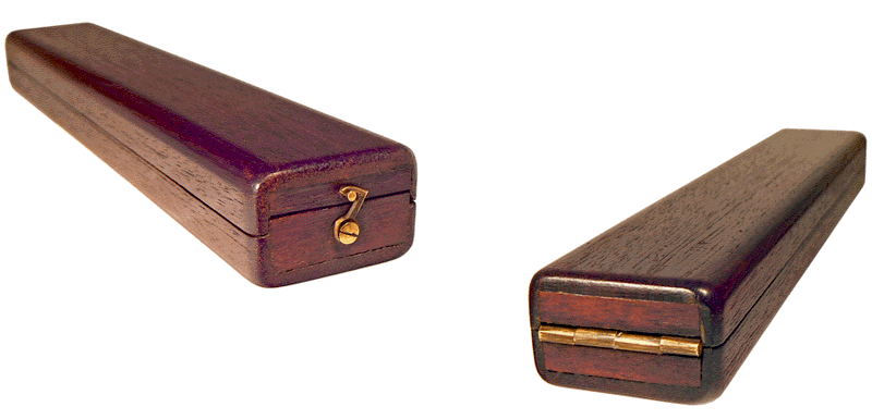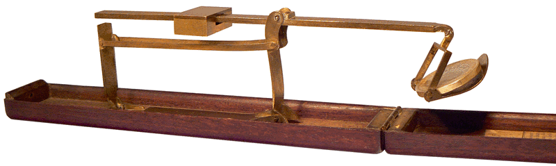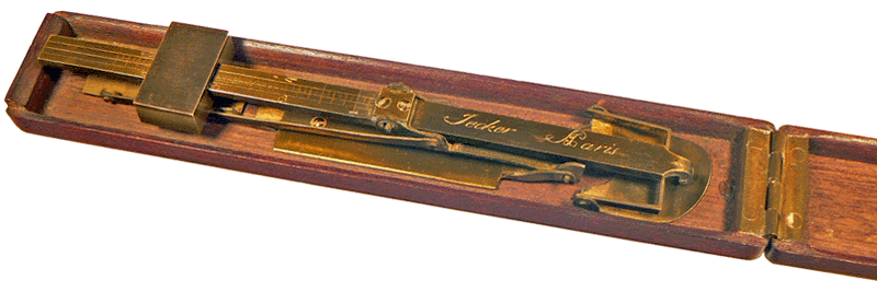 L'étui en acajou de 15,8 x 2,8 x 1,8 cm, renferme un trébuchet monétaire signé JECKER A PARIS - Vers 1800. |