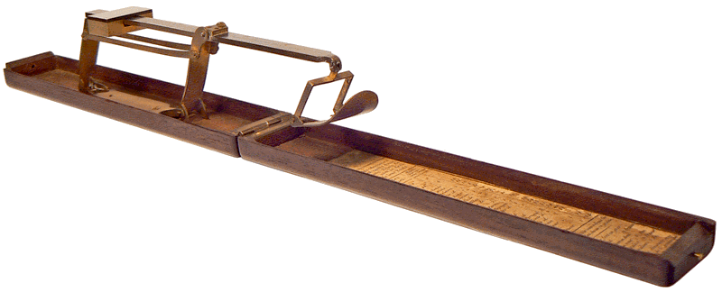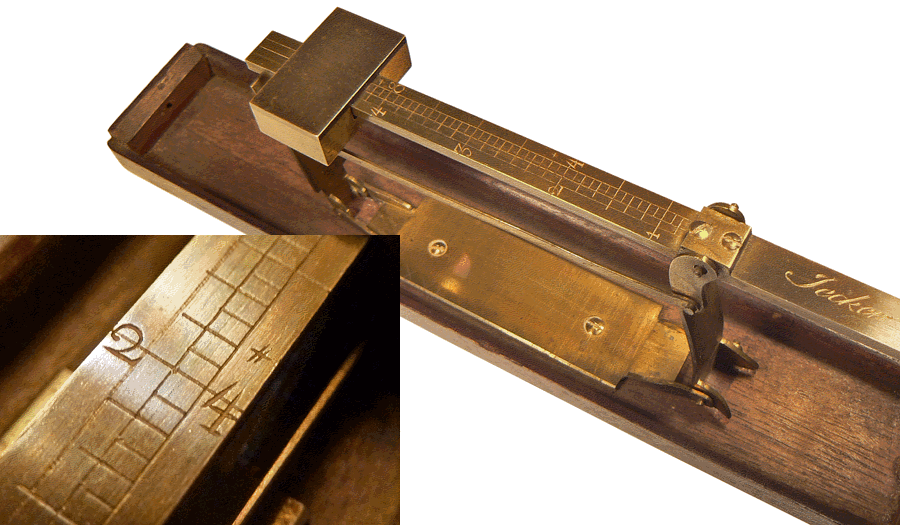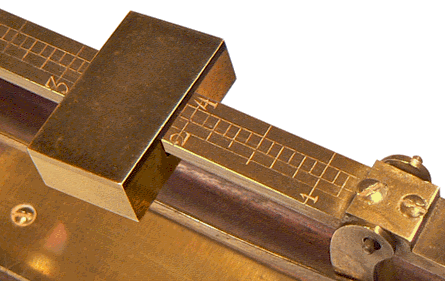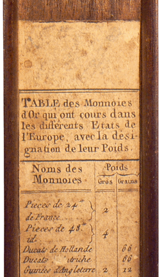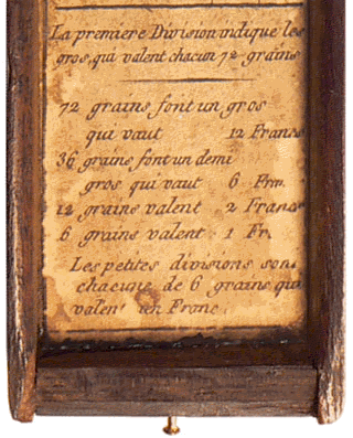 Les grandes divisions du fléau sur lequel glisse le contrepoids sont repérées sur un côté par leur correspondance en gros : 1, 2, 3 et 4. Chaque gros est divisé en 12 parties valant chacune 6 grains. Un gros (environ 3,824 g) vaut 72 grains. Pour faciliter la lecture lors de la vérification des pièces d'or française, le constructeur a subtilement indiqué le poids et la valeur. Sur l'image ci-dessus, le "2" a une double signification : c'est le 2 de 2 gros (le poids) et le 2 de 24 livres (la valeur). Il en est de même pour le 4 de 4 gros qui est aussi le 4 de 48 livres. On retrouve, au dessus des deux nombres 24 et 48, le même symbole de la livre tournois que sur la tables des monnaies. |