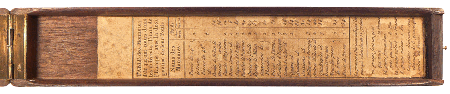La table des monnaies, en très petits caractères, sur un papier de 12 x 2,4 cm |