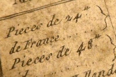 La TABLE des Monnoies d'Or donne le "poids", exprimé en gros et grains, d'une vingtaine de pièces ayant cours dans différents pays d'Europe, du Ducat de Hollande à la Pièce de Prusse en passant par le Sequin de Rome et la Pistole d'Espagne. L'ouverture se fait sur deux pièces d'or de 24 et 48 "livres tournois de France" pesant respectivement 2 et 4 gros. Le symbole utilisé est de très petite taille et placé en exposant. Il s'agit, sous forme stylisée, d'un l (pour livre) suivi d'un t (pour tournois) dont la barre traverse le l. |