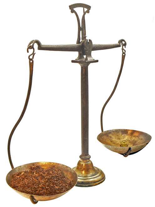 L'opération consiste à prélever 2 onces de tabac. Le poids de 2 onces est placé dans l'une des coupelles et le tabac est ajouté peu à peu dans l'autre jusqu'à obtention de l'équilibre. Il s'agit, là, d'une simple pesée... |