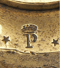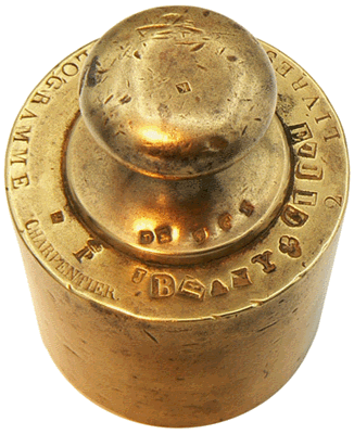 Le poids utilisé appartient à une boîte, malheureusement incomplète, signée CHARPENTIER, balancier au 73 rue Saint-Denis à Paris durant le premier tiers du XXe siècle et dont on voit la marque, le "P couronné" (CHARPENTIER est le successeur de POURIN, Balancier-Mécanicien), sur la photo de gauche. A droite, il s'agit de la marque du poinçon "à la fleur de lys" garantissant la vérification avant la mise en service. Cette marque a été remplacée en 1853 par la "marque à la bonne foi", représentée par une poignée de mains... |
