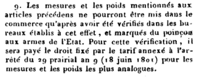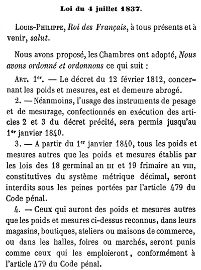 A droite, 2 onces ou 62,5 grammes, 8 onces ou 250 grammes, 2 livres ou 1 kilogramme, 1 livre ou 500 grammes, sont des "poids" dont l'usage a été autorisé par le décret du 12 février 1812 et jusqu'à fin 1839 afin - pensait-on - de favoriser l'admission du système métrique établissant l'uniformité des poids et mesures dans toute la France. Le décret de 1812 "allait directement contre le but qu'on voulait atteindre ; au lieu de rendre commun et populaire l'emploi du système métrique, il ne faisait que consacrer des habitudes déjà trop enracinées ; il augmentait même la confusion par le mélange des anciennes et des nouvelles mesures. On avait cru un peu légèrement que les anciennes mesures étaient plus en harmonie avec les besoins du peuple ; mais comme le faisait remarquer M. de ministre du commerce en présentant la loi à la Chambre des députés, le législateur de 1812 n'avait pas compris que c'étaient les habitudes du peuple et non ses besoins qui avaient résisté à l'admission du système métrique. " On reconnaît facilement, disait-il, en y réfléchissant, que la division de l'unité de poids, par exemple, en 16 onces, ne correspond pas davantage, absolument parlant, aux besoins de l'homme du peuple que la division en 250 grammes, et qu'il suffit d'une habitude contraire pour qu'il exprime directement et sans traduction son besoin du moment par des sous-multiples décimaux du demi-kilogramme, tout aussi bien que par des divisions binaires de la livre." (...)" - (Collection des lois, décrets, ordonnances, règlements et avis du Conseil d'Etat - année 1837) |