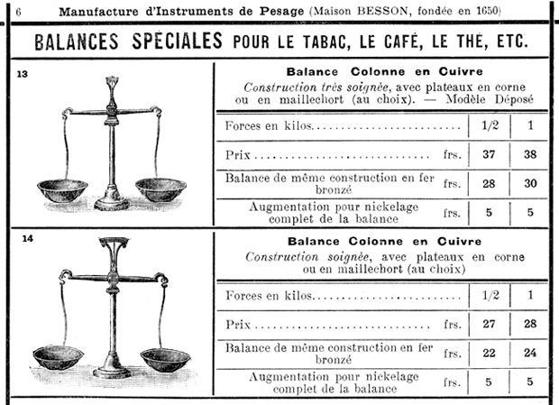 Au tout début du XXe siècle, des balances similaires sont proposées sur catalogue de la MAISON BESSON (à Paris) : "Balances spéciales pour le tabac, le café, le thé, etc". Les prix, d'une vingtaine à une quarantaine de francs, dépendent de la force et de la finition. |