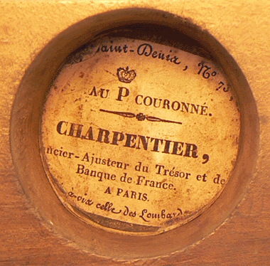 Dans la boîte en noyer et au fond du logement de ce poids, les indications du constructeur : |