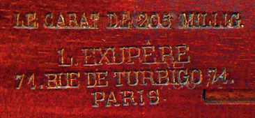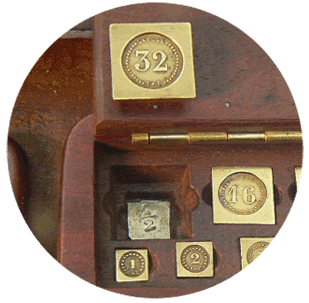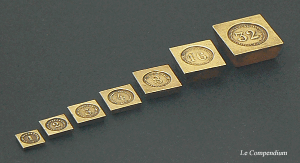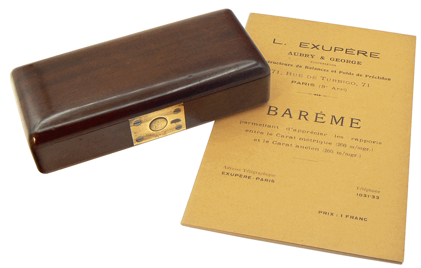 La boîte renferme des "poids carats" en forme de pyramide quadrangulaire tronquée. Leur valeur est exprimée en carat de 205 mg. Ce carat, que l'on appelle maintenant carat ancien, a été remplacé par le carat métrique défini par la 4ème conférence des poids et mesures de 1907 et seul autorisé à partir de juin 1909 : il correspond à 200 mg. Notre coffret a dû être utilisé pendant la période transitoire et était peut-être accompagné du "Barême" édité par la maison Exupère et permettant de réaliser facilement les conversions d'une unité à l'autre. Le carat ancien de 205 mg est, en effet, divisé en 64 parties alors que le carat métrique de 200 mg, assujetti à la division décimale est divisé en 100 parties. |