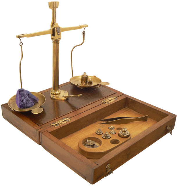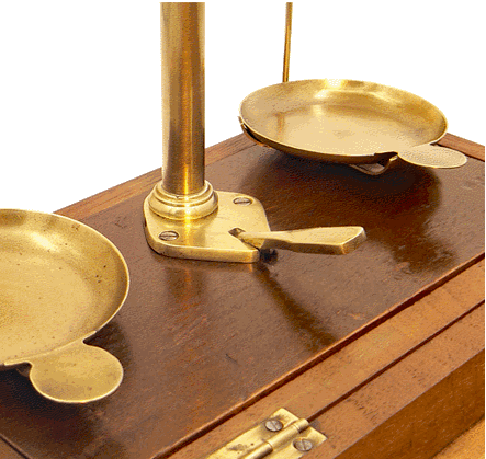 Le trébuchet est prêt pour la pesée. Il est doté d'une suite de poids totalisant 50 g : 20g, 2 fois 10 g, 5 g, 2 fois 2 g et 1 g. Un logement circulaire renferme les subdivisions du gramme : 5 dg, 2 dg et 2 fois 1 dg. Le diamètre des plateaux est égal à 5,3 cm. |