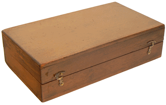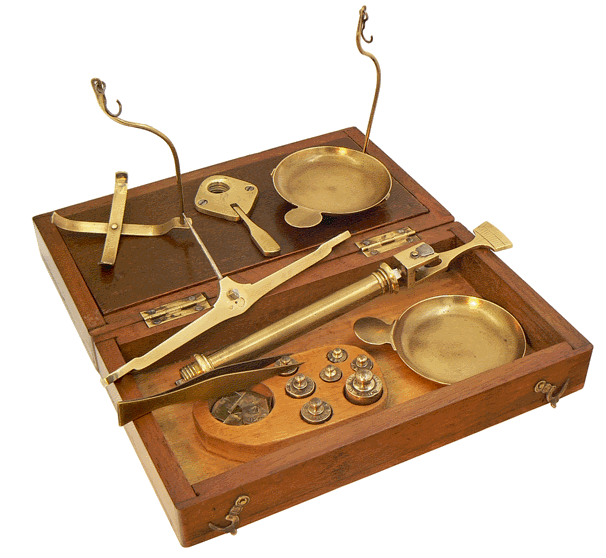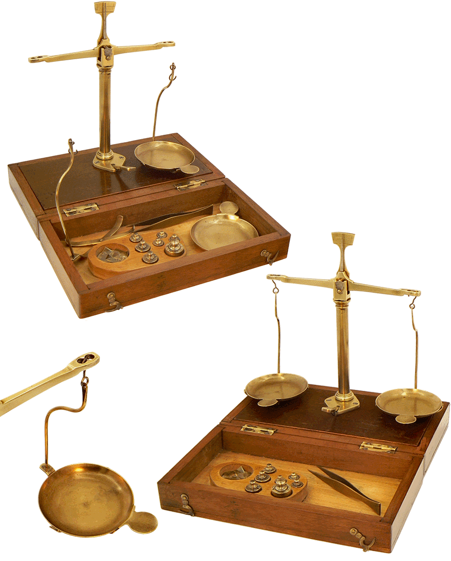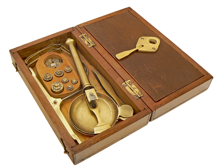 La boite contient les éléments nécessaires à la mise en œuvre d'un petit trébuchet sur colonne et à pédale. L'instrument est utilisable pour peser des objets jusqu'à 50 grammes avec une précision du décigramme. |