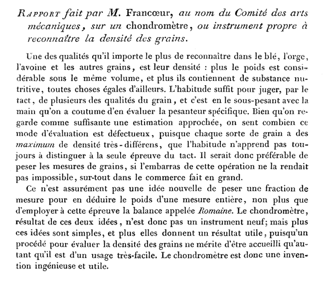 Ce texte est le préambule d'un rapport du BULLETIN DE LA SOCIÉTÉ D'ENCOURAGEMENT POUR L'INDUSTRIE NATIONALE de 1818. L'auteur donne un certain nombre de détails sur la construction et l'utilité du chondromètre, instrument propre à reconnaître la densité des grains (...) et dont la construction ne dépasse pas la portée des ouvriers ordinaires. L'instrument présenté sur cette page est un modèle de poche destiné au blé. |